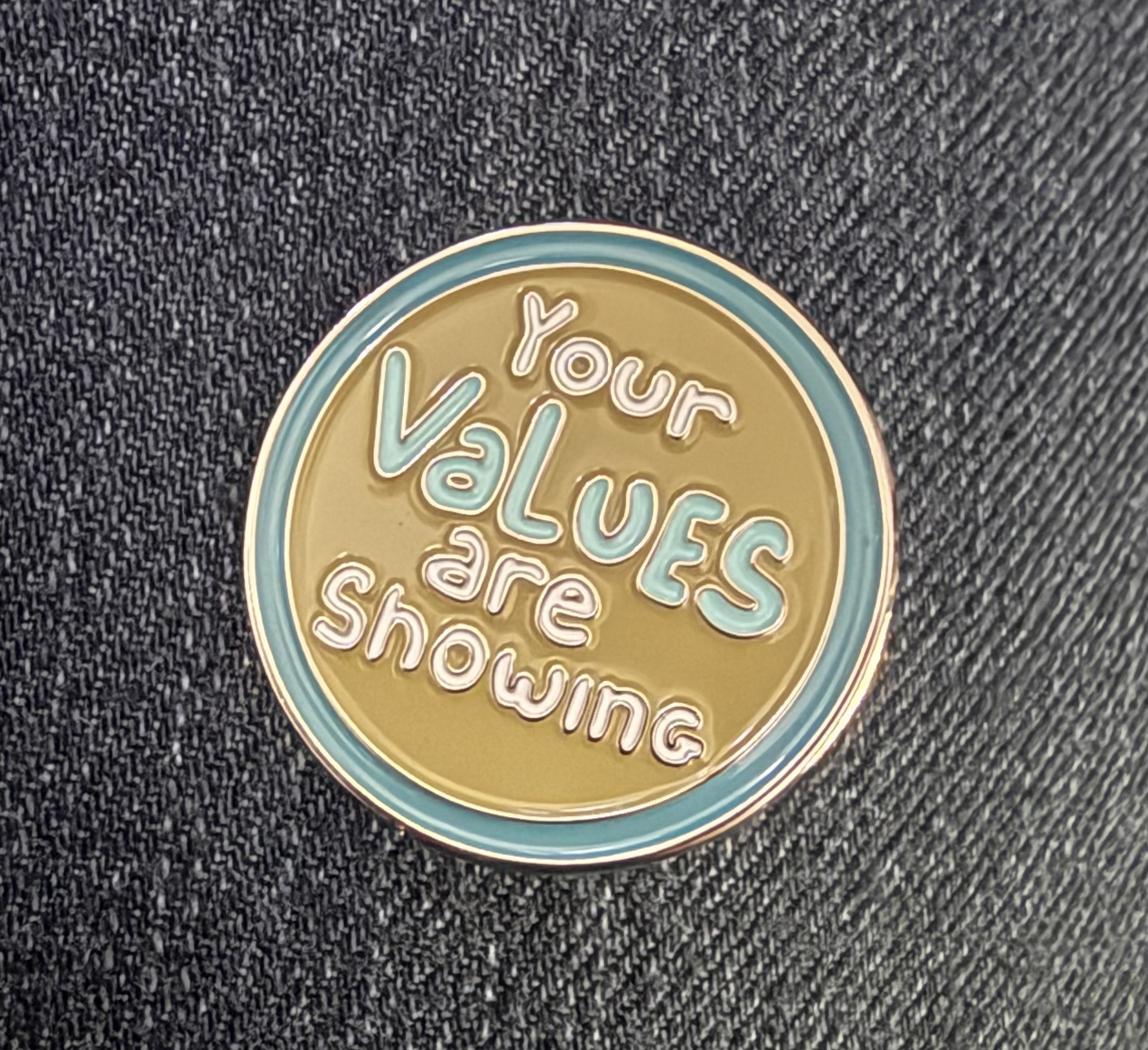 - High-quality enamel pin with “Your Values Are Showing” message